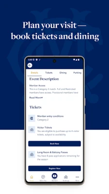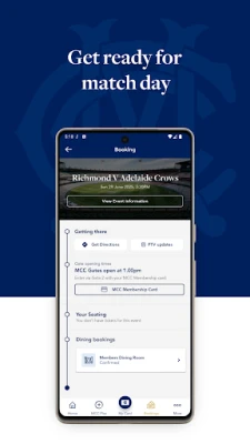 • View and manage your upcoming events and functions. On match days view your dining bookings, reserved seat and visitor tickets and general match information.