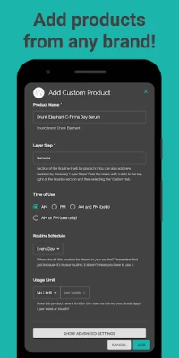 You can add custom skincare products from other brands by selecting the option in the top-right menu in the Routine section or from the Custom tab in the Products section.