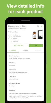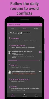 Each morning and evening, check each product off your list to keep track of which treatments you have used. This will allow the app to prevent any conflicts by showing you which products should be avoided.