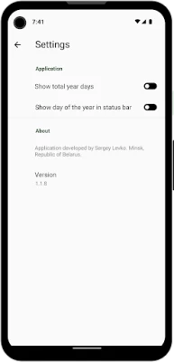 The application shows current day of year on the main screen. Tapping on the text with current day of year on main screen will copy this value to clipboard. User can also enable displaying current day of year in status bar.