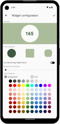 The application supports home screen widgets showing day of year which has two types of size: 1x1 and 2x2. User can customize widget's style on configuration screen. Widget customization allows user to change widget's form, background colour, background opacity and text colour. Tapping on the widget's text will copy current day of year value to clipboard.